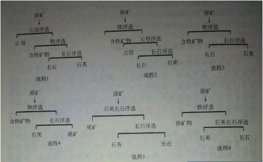 流程5:用胺作捕收剂,混合浮选石英和长石,混合精矿分离时加氟氢酸和胺浮选长石,尾矿便是石英精矿。